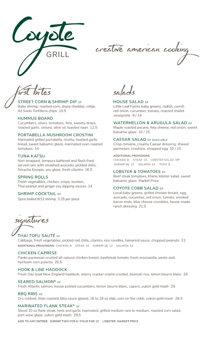 Salad lovers are well covered with choices like Watermelon & Arugula Salad, Coyote Cobb Salad, and Lobster & Tomatoes, while the signature dishes elevate the menu further. Plates such as Thai Tofu Sauté, Chicken Caprese, Hook & Line Haddock, Seared Salmon, BBQ Ribs, Thai Red Curry Bowl, Shrimp Scampi, Atlantic Salmon, and Grilled Flat Iron Steak highlight the kitchen’s ability to move confidently between seafood, poultry, vegetarian, and red meat offerings. The entrées, including Crispy Tofu, Noodle Bowl, Seared Chicken & Lobster Ravioli, Marinated Grilled Statler Chicken, and Gulf of Maine Salmon, reinforce this sense of range and consistency.