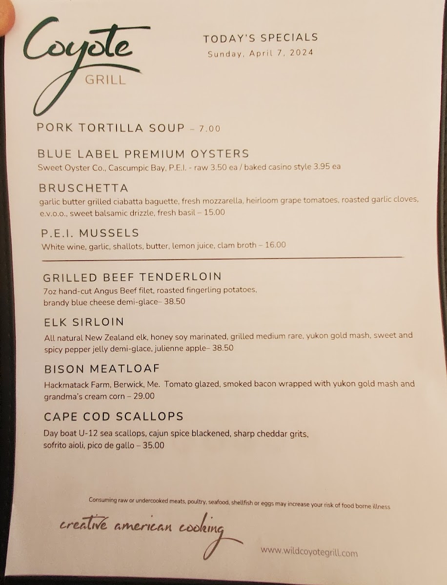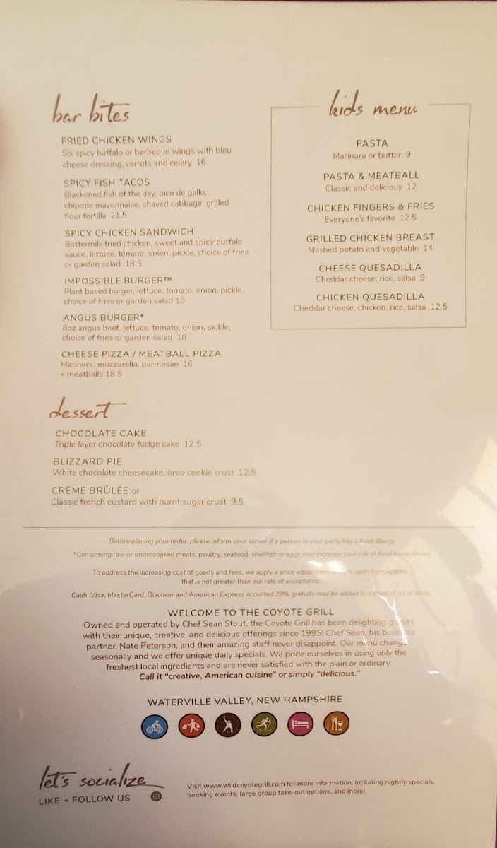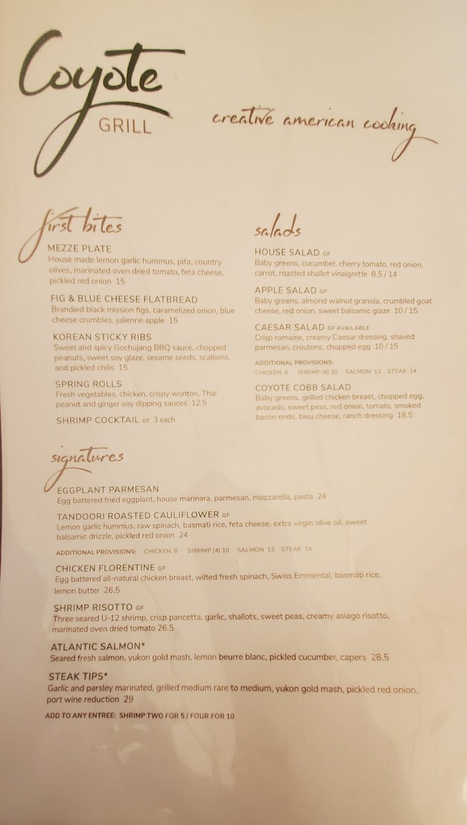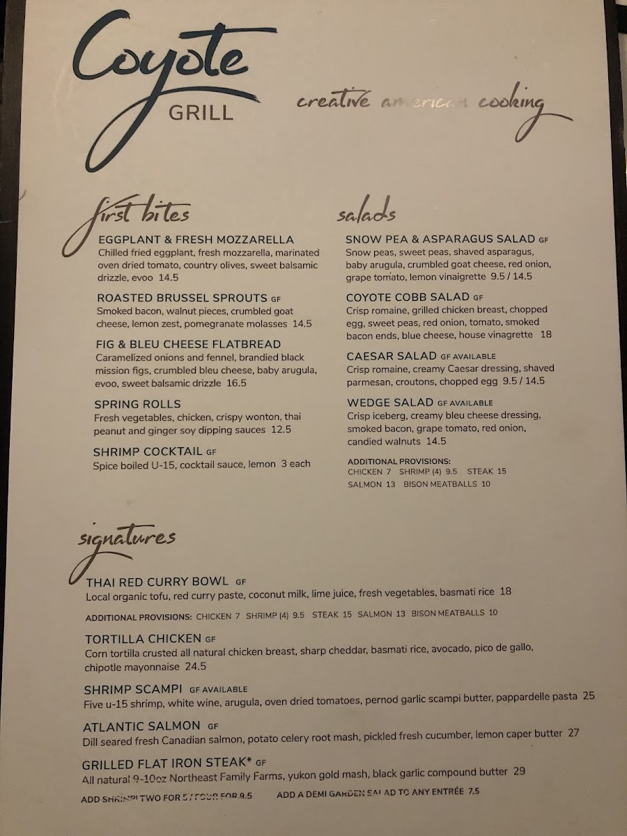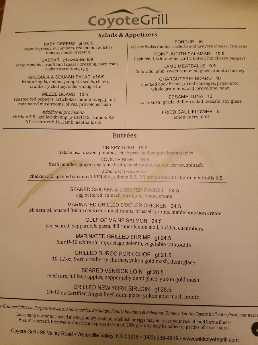 Wrapping up the dining experience at Coyote Grill, the menu feels like a confident summary of what the restaurant does best: variety, balance, and broad appeal without losing character. From the very beginning, the starters set the tone with familiar yet thoughtfully executed options such as the House Salad, Caesar Salad, Strawberry Power Salad, and the more indulgent Maine Lobster & Tomatoes. These lighter beginnings transition smoothly into more substantial plates, where dishes like Vegetable Cannelloni, Chicken Tandoori, Pan Seared Chicken Breast, Seafood Sauté, and Atlantic Cod Loin showcase a menu that comfortably blends comfort food with global influences.