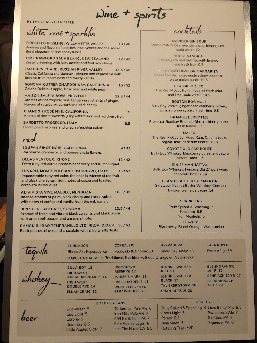To finish, desserts like Chocolate Cake and Blizzard Pie provide a simple, satisfying close, while the extensive drink list-from Lavender Gin Sour and Spicy Watermelon Margarita to curated wines, drafts, and spirits-rounds out the experience. Overall, the Coyote Grill menu feels cohesive yet diverse, making it easy for different tastes and occasions to come together in one well-rounded dining destination.